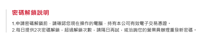申請密碼解鎖前,請確認您現操作的電腦,持有本公司有效電子交易憑證。